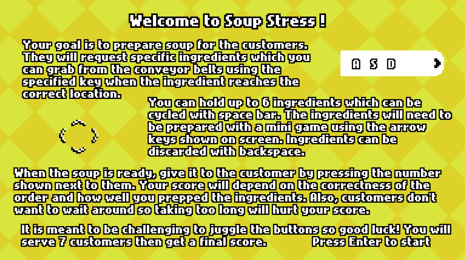 The game is meant to be hard at first, but it gets easier as you learn the controls. I wanted to add difficulty scaling but ran out of time. The number of ingredients per customer is random so a run with fewer ingredients should be easier but rewards fewer total points.